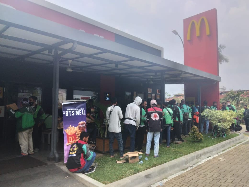 Gerai Mc Donald's Cibitung, Cikarang Barat, Kabupaten Bekasi, Jawa Barat pada Rabu (9/6/2021) diserbu oleh (ojok online) Ojol untuk membeli pesanan promo The BTS Meal. (foto: mira)