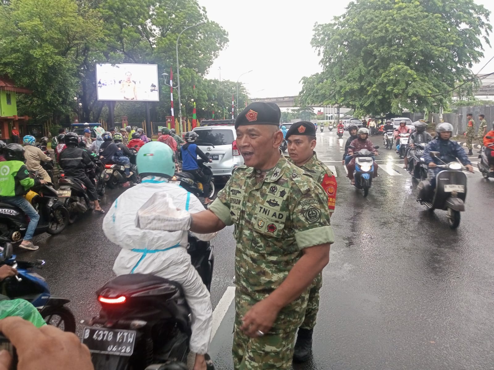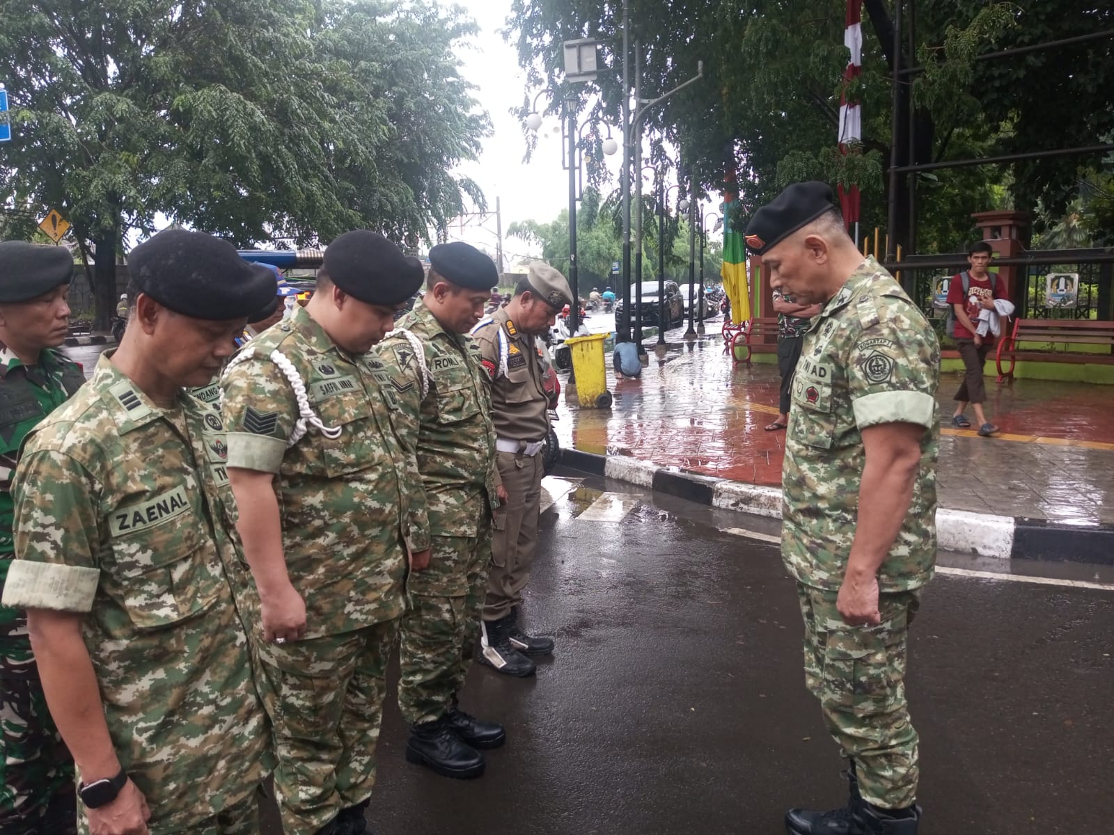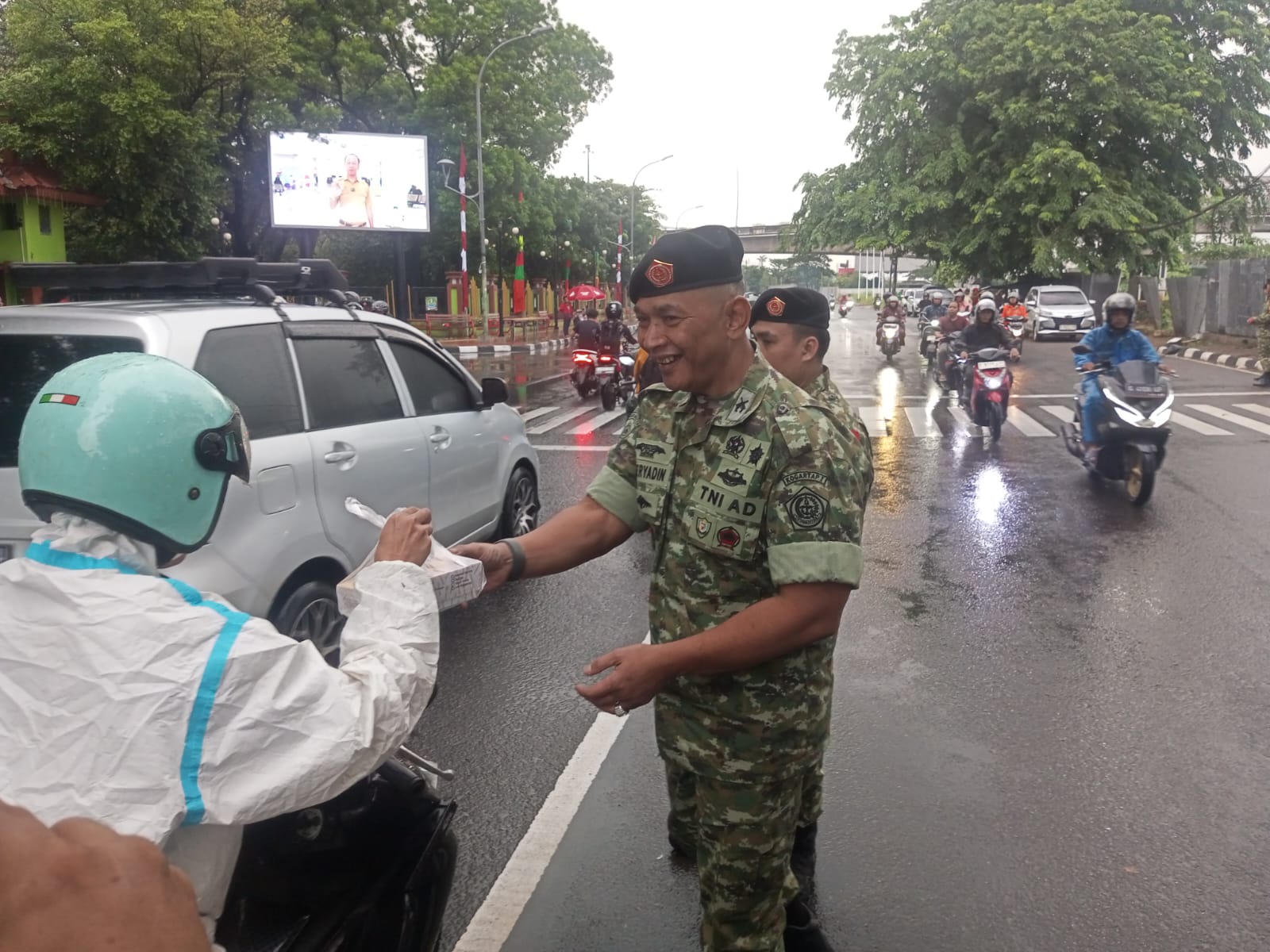 Di tengah rintik hujan yang membasahi Jalan Ir. Juanda Raya, tepat di depan Kantor Pemerintah Kota Bekasi, Kelurahan Margajaya, Bekasi Selatan, para prajurit tetap berdiri di tepi jalan sambil menyapa para pengguna jalan yang melintas, dalam program Jumat Berkah.