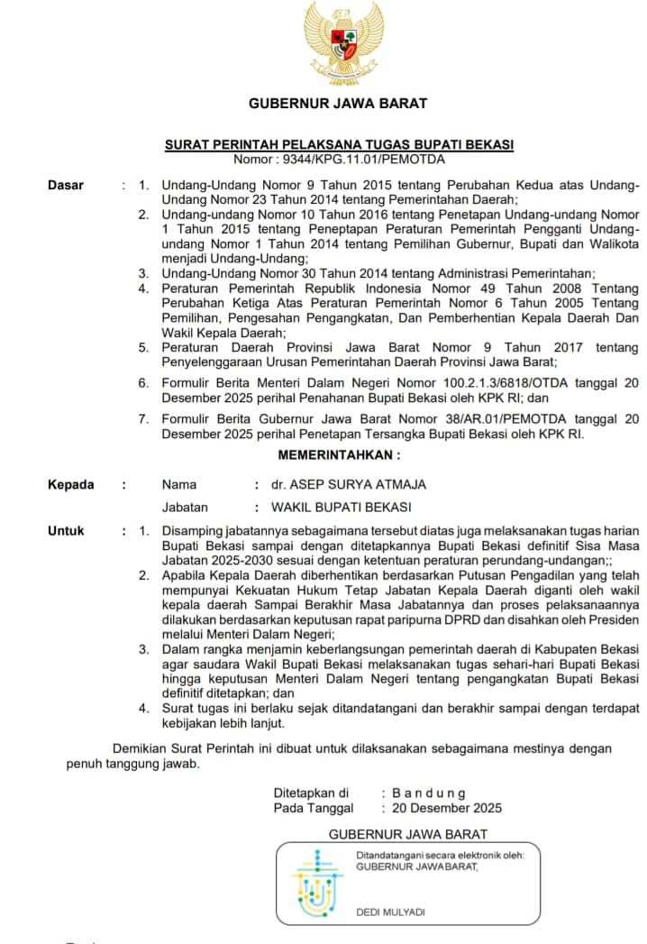 Pemerintah Provinsi Jawa Barat secara resmi menetapkan Asep Surya Atmaja sebagai Pelaksana Tugas (Plt) Bupati Bekasi. Penetapan tersebut tertuang dalam Surat Perintah Pelaksana Tugas yang dikeluarkan Gubernur Jawa Barat, Dedi Mulyadi, dengan nomor 0344/KPG.11.01/PEMOTDA. Bandung, JAWA BARAT pada Sabtu (20/12/2025). (ist)