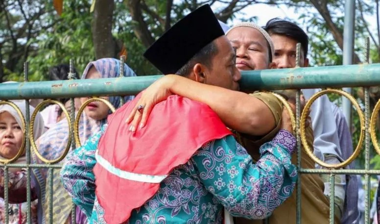 Pengantar jamaah berpelukan dengan jamaah calon haji sebelum keberangkatan menuju embarkasi haji di kompleks perkantoran Pemerintah Kabupaten Bekasi, Jawa Barat, pada musim keberangkatan ibadah haji tahun 2023. (ist/ant)