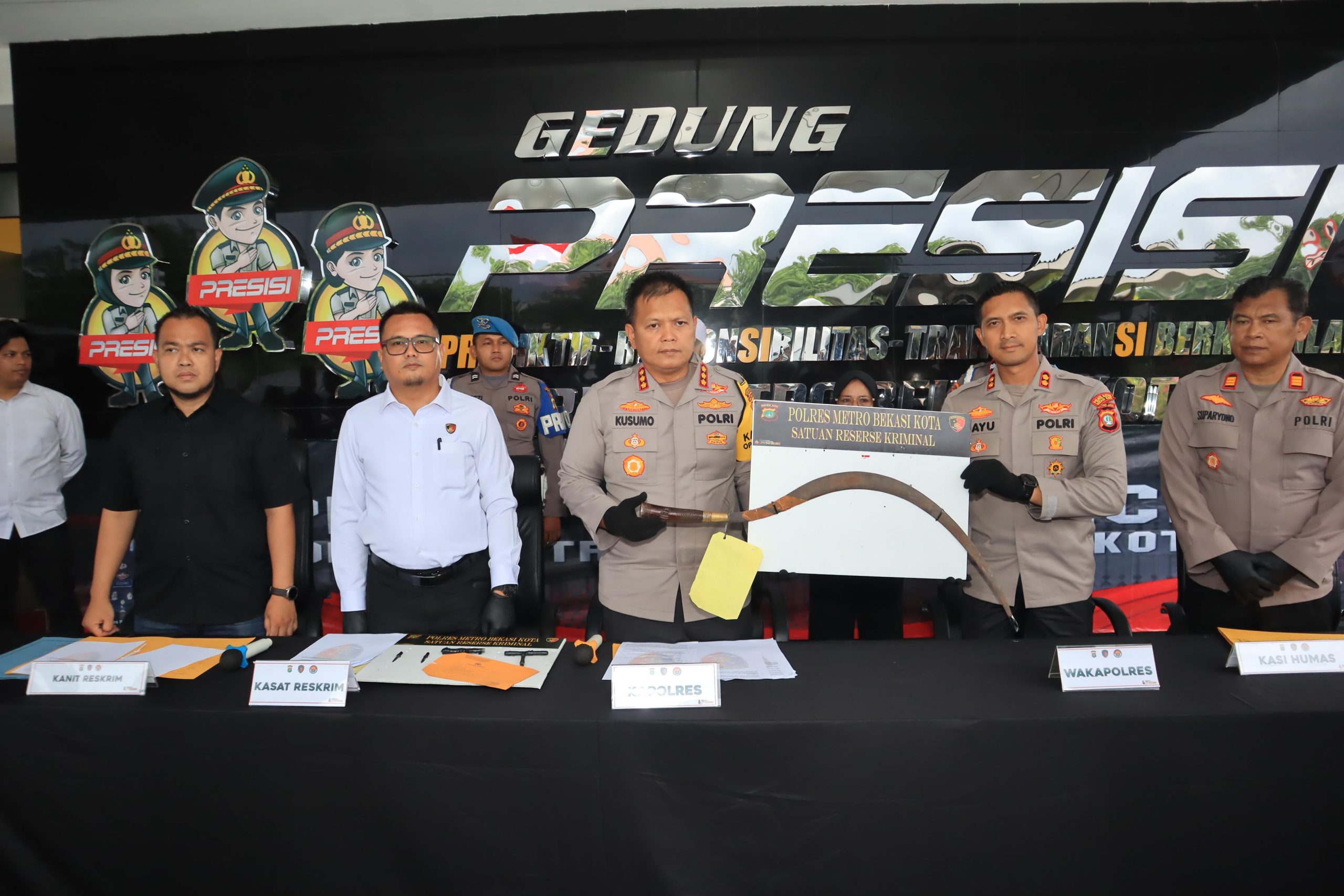 BEKASIPEDIA.com | KOTA BEKASI – Kapolres Metro Bekasi Kota Kombes Pol Kusumo Wahyu Bintoro, S.H., S.I.K., M.H, didampingi Wakapolres AKBP Bayu Pratama Gubunagi, S.H, S.I.K., M.Si, Kasat Reskrim AKBP Braiel Arnold Rondonuwu, dan Kasi Humas AKP Suparyono menggelar konferensi pers pengungkapan kasus pencurian dengan pemberatan (Curat) kendaraan roda dua di Lobi Mapolres, Senin (3/11/2025).